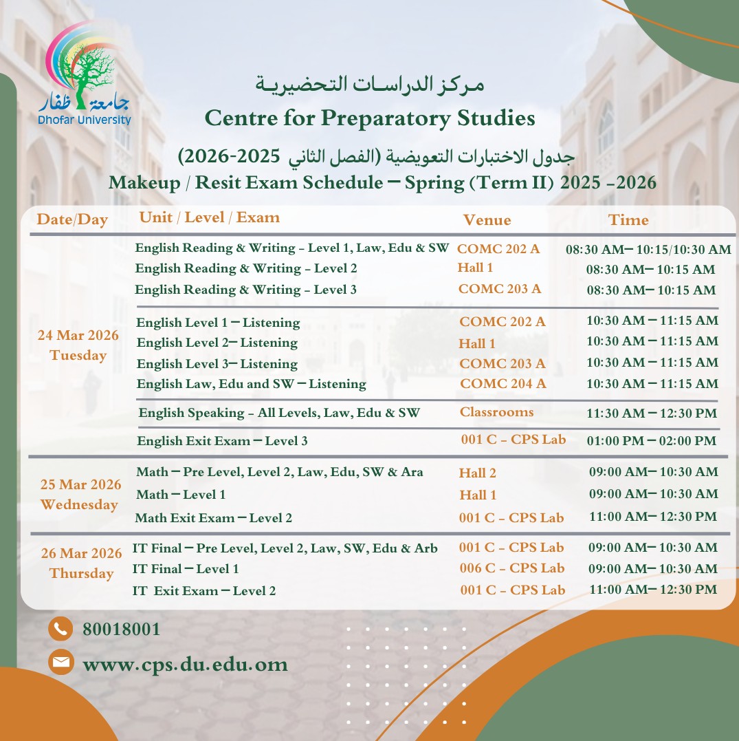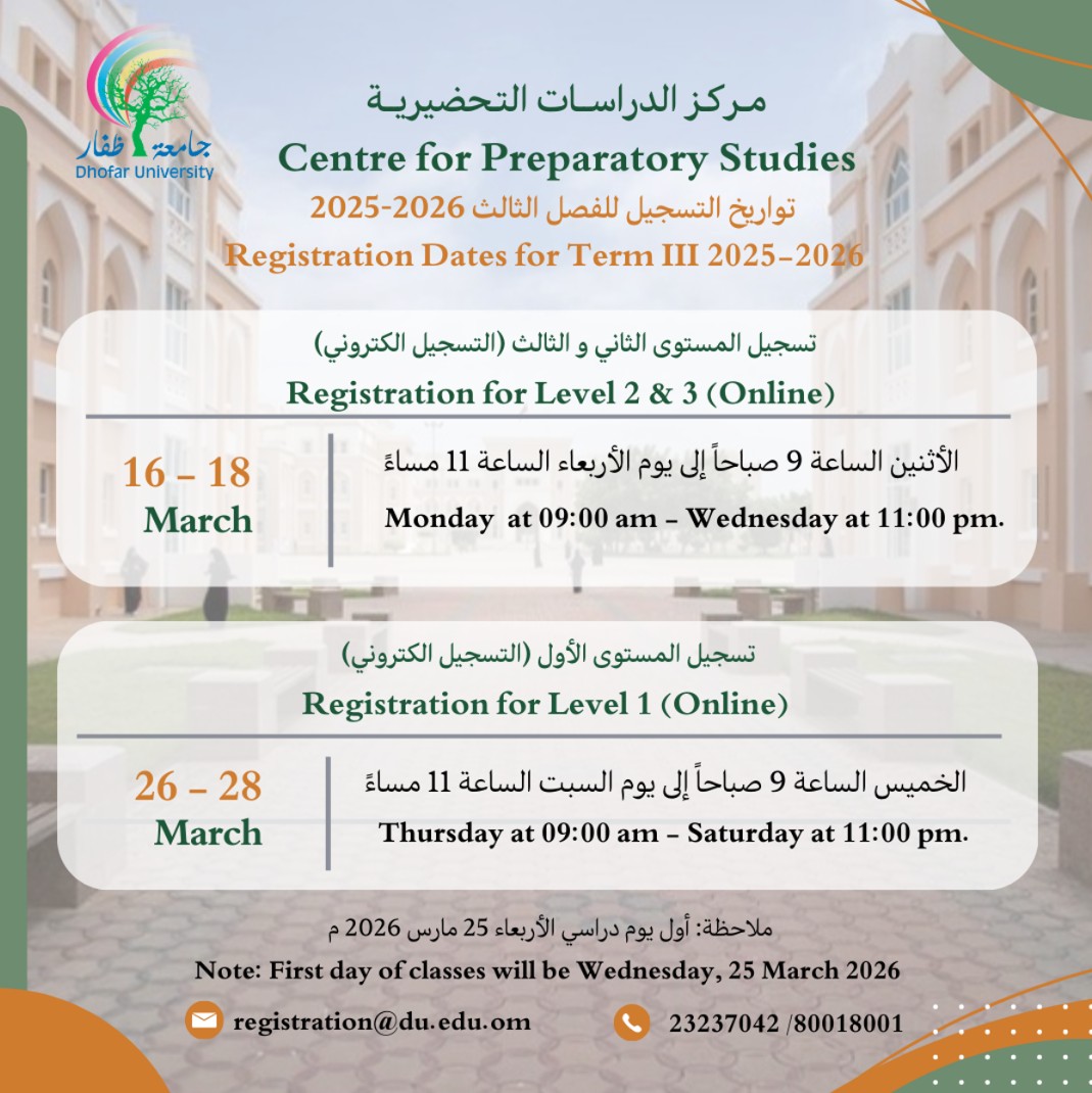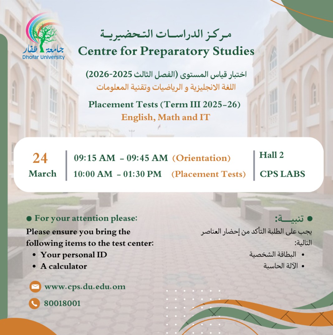 Important information for CPS students معلومات هامة لطلبة البرنامج التأسيسي Important information for CPS students: Placement Test Schedule – جدول اختبار قياس المستوى Makeup Exams Schedule – جدول الاختبارات التعويضية Registration Plan – خطة التسجيل Explaining how to register – شرح طريقة التسجيل March 15, 2026 |